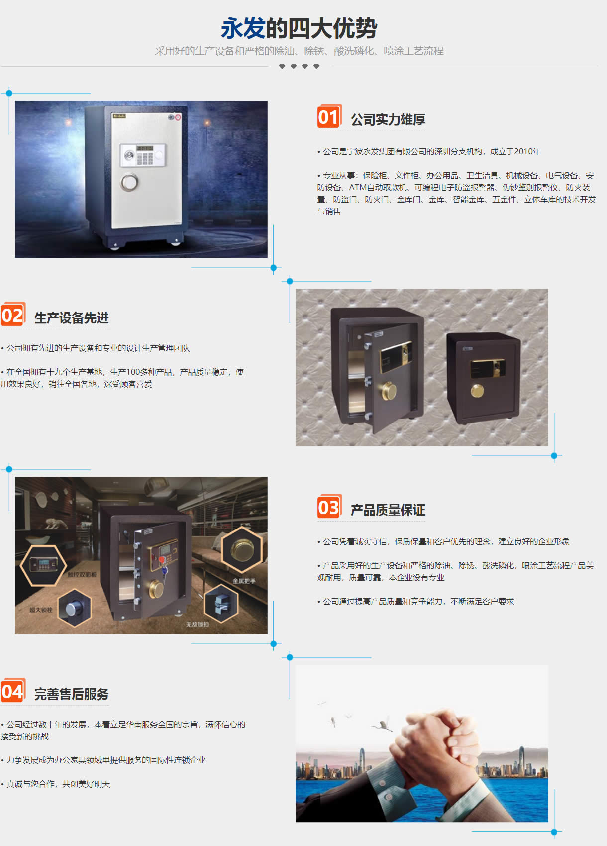 深圳永發(fā)安防產(chǎn)品有限公司 深圳永發(fā)安防產(chǎn)品有限公司,是寧波永發(fā)集團有限公司的深圳分支機構(gòu),成立于2010年,專業(yè)從事:保險柜、文件柜、辦公用品、衛(wèi)生潔具、機械設(shè)備、電氣設(shè)備、安防設(shè)備、ATM自動取款機、可編程電子防盜報警器、偽鈔鑒別報警儀、防火裝置、防盜門、防火門、金庫門、金庫、智能金庫、五金件、立體車庫的技術(shù)開發(fā)與銷售。